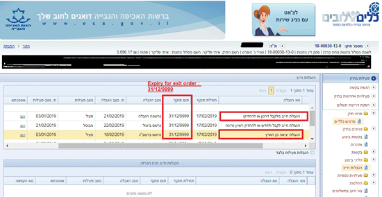 Lower red box Restriction of leaving Israel Date started 17/2/2019: end of period 31/12/9999