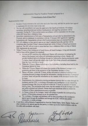 President Trump’s Peace Plan for Gaza has taken one giant step forward for mankind following Israel and Hamas signing a document headed: Implementation Steps for President Trump’s proposal for a “Comprehensive End of Gaza War” (See document below)