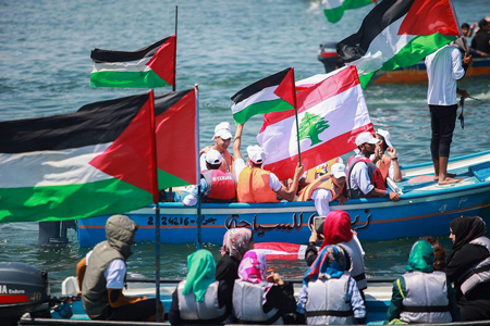 Palestinians hold flags as they ride a boat during a rally marking the fifth anniversary of the “Mavi Marmara” flotilla at the seaport of Gaza City on May 31, 2015. Credit: Aaed Tayeh/Flash90.