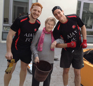 Together with the AJAX President Ronnie Lewis and immediate past President and dedicated Jewish Care volunteer Ian Fayman, eight AJAX players helped improve the residential gardens. From high pressure cleaning and emptying the fountains to filling the garden beds with fresh soil, they all demonstrated a ‘best on ground’ performance and have helped to enhance the living conditions of residents.