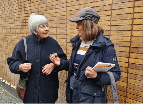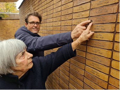 Dorien van Dijk-Visser presents Liesbeth Prins’ birth medallion to Anne Slade on behalf of the Sydney Jewish Museum, in front of the memorial bricks for the Prins family