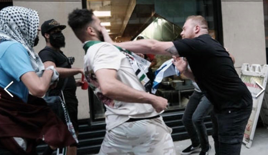 Snir Dayan and Amit Skornik defending themselves after being attacked by pro-Palestinian protesters in New York City, May 2021. Source: Screenshot.