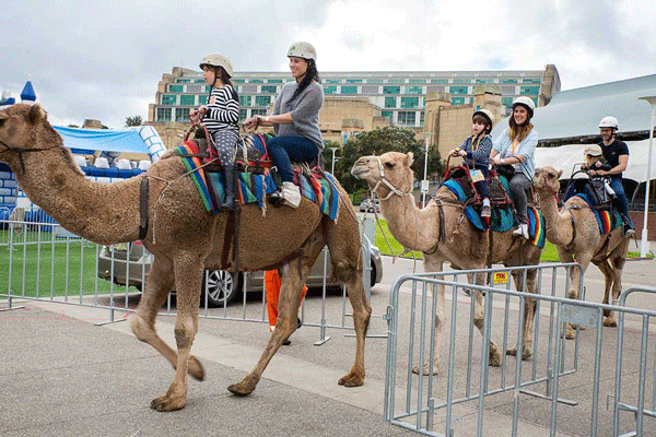 The event theme was a trip to Israel so hundreds of excited children were treated to activities that represented each Israeli city or region: camel rides in the Negev, a kibbutz petting zoo in the Galil, a giant inflatable mountain slide in the Golan, a sandpit beach in uia290Eilat and the famous Tel Aviv music scene was captured by live musical entertainment. In Jerusalem, children were invited to write notes and stick them between the bricks of a very realistic mini kotel. These notes will now be transported by the UIA to the kotel in Jerusalem! Families also enjoyed quieter moments as they relaxed in a Bedouin tent while sharing their Israeli lunch of felafel and hot chips, followed by free ice cream.
