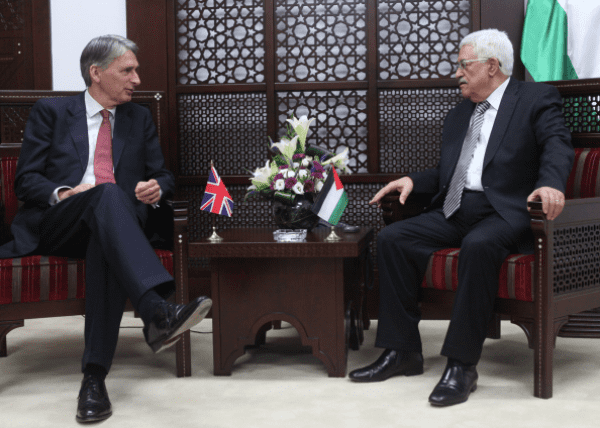 Palestinian Authority leader Mahmoud Abbas (right) meets with British Foreign Secretary Philip Hammond in the West Bank city of Ramallah on July 23, 2014. Photo by Issam Rimawi/Flash90. Courtesy: Al-Hayat Al-Jadida via PMW