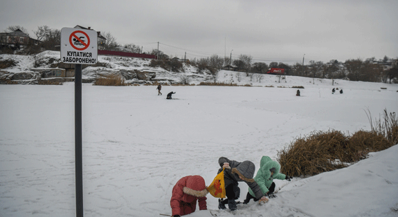 Jewish adults and children at a frozen lake in the city of Uman, in central Ukraine, on Jan. 26, 2022. Photo by Yossi Zeliger/Flash90