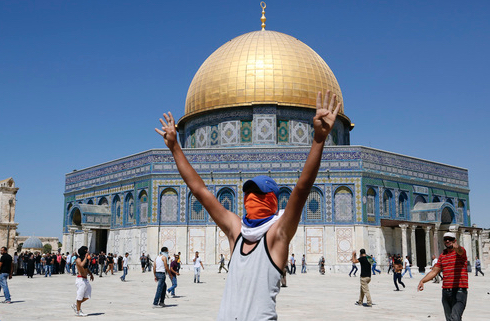 A Palestinian rioter raises his hands in a “V” for “victory” near the Dome of the Rock on the Temple Mount in Jerusalem. Photo by Sliman Khader/Flash90