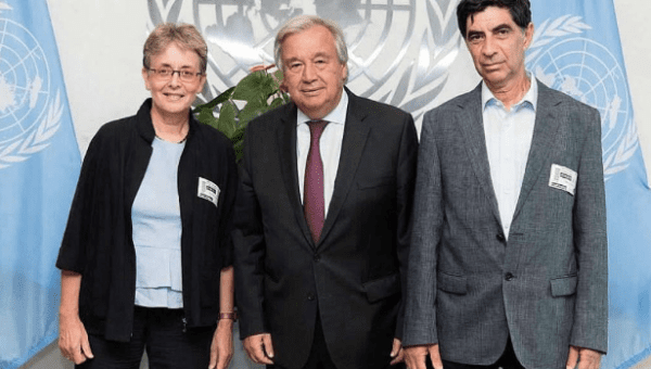 Leah and Simcha Goldin, the parents of Israeli soldier Hadar Goldin, with U.N. Secretary-General António Guterres. Photo courtesy of Leah Goldin.