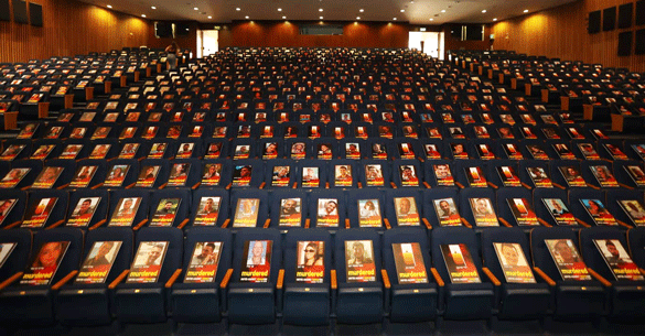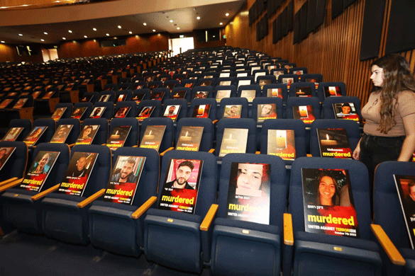 Pictures of over 1,000 persons abducted, missing, or killed in the Hamas attack were displayed on empty seats in the Smolarz Auditorium at Tel Aviv University.