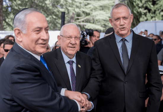 Israel’s President Reuven Rivlin, Prime Minister Benjamin Netanyahu, and Blue and White leader Benny Gantz at the memorial ceremony for the late Israeli President Shimon Peres at Mount Herzl cemetery in Jerusalem on Sept. 19, 2019. Photo by Yonatan Sindel/Flash90.