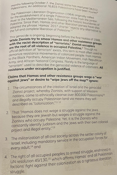 This pamphlet wants you to believe that Hamas is merely resisting “occupation.” In fact, Israel withdrew entirely from Gaza in 2005 — a move verified by the UN and international observers — removing every last settler and soldier. In return, Hamas launched thousands of rockets at Israeli civilians, dug terror tunnels under the border, and on October 7 committed one of the most horrific pogroms since the Holocaust.