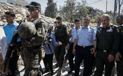 Head of Palestinian national security forces in Hebron Brig. Gen. Hazem Abu Hanood and head of the Palestinian police Brig. Gen. Ahmad Abu Rob talk to residents during a visit to the Old City in Hebron on July 31, 2018. Photo by Wisam Hashlamoun/Flash90.