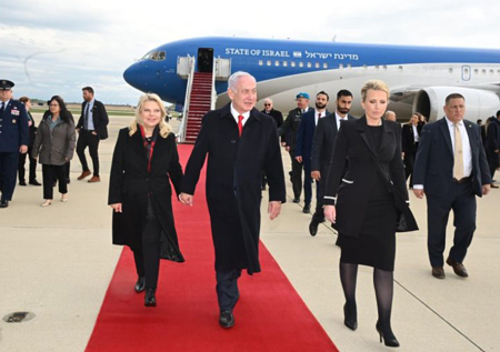 Israeli Prime Minister Benjamin Netanyahu and wife Sara arrive in Washington on April 6, 2025. Photo by Avi Ohayon/GPO/TPS-IL