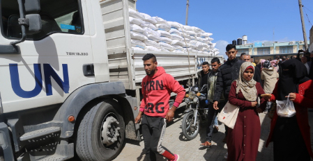 Palestinians come to receive food aid from a UNRWA distribution centre in the Khan Younis camp in the southern Gaza Strip, March 7, 2020. Photo by Fadi Fahd/Flash90