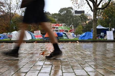 Tents seen at a Pro-Palestine encampment at the University of Melbourne in Melbourne, Friday, May 17, 2024. (AAP Image/Joel Carrett)