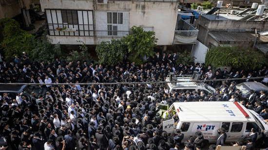 An enormous crowd gathers for the funeral procession of Rabbi Avishai Yechezkel, 29, who was one of four people killed in a terrorist shooting attack in Bnei Brak, Israel, on March 30, 2022. Photo by Yonatan Sindel/Flash90.