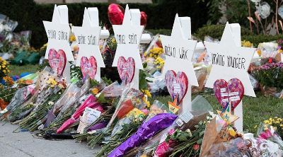 A memorial outside of the Tree of Life*Or L’Simcha Synagogue in Pittsburgh following the mass shooting on Oct. 27, 2019 that left 11 Jewish worshippers dead. Credit: Wikimedia Commons.