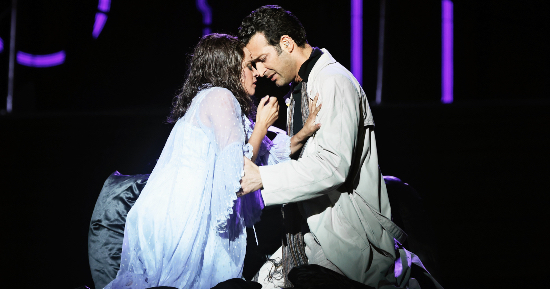Stacey Alleaume as Violetta Valéry and Rame Lahaj as Alfredo Germont in Handa Opera on Sydney Harbour’s 2021 production of La Traviata at Mrs Macquaries Point.