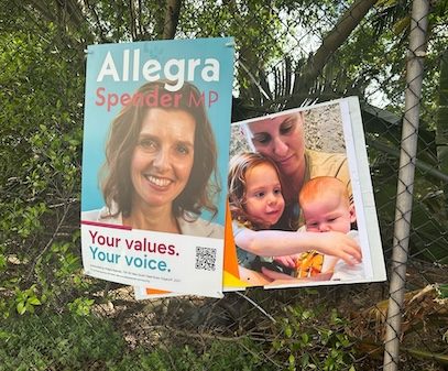 JWire has received the following time-stamped image from Allegra Spender’s team together with a statutory declaration from the person who placed the corflute sign. The declaration states that, on Sunday morning when the sign was placed, there were no other signs or displays near it, “certainly no posters with images of the Bibas family”.