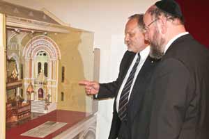 Stephen Rothman shows Chief Rabbi Ephraim Mirvis a model of Sydney’s Great Synagogue