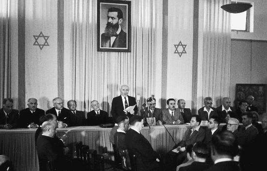 Israeli founding father and first prime minister David Ben-Gurion declares independence beneath a large portrait of Theodor Herzl, founder of modern Zionism. Credit: Wikimedia Commons.