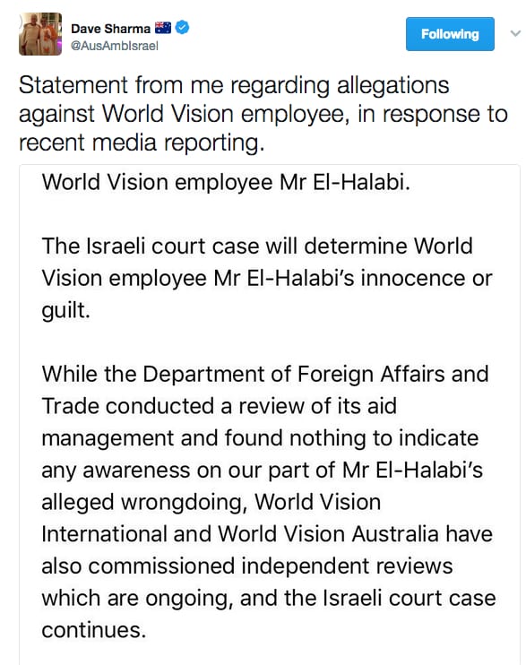 But Australia’s ambassador to Israel Dave Sharma sent this tweet following the ABC report.