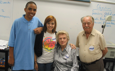 Holocaust survivor Lydia Lebovic with her husband, William, meeting with students Tiara Simpson and Dante Carroll. Credit: Courtesy