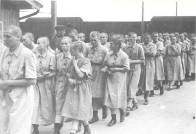 A photograph taken by a Nazi guard of the women entering the camp after having their heads shaved. Lydia Lebovic is in the middle of the photograph. Credit: Courtesy
