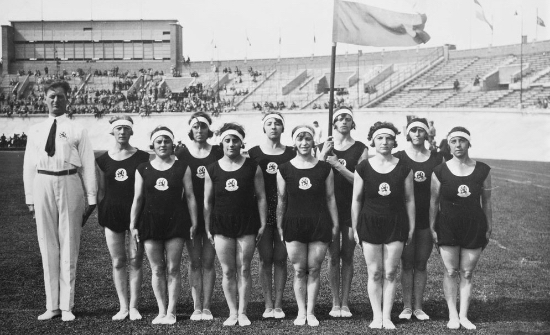 The Dutch women’s team, which won the gold medal for gymnastics at the Amsterdam Olympics, in the Olympic Stadium with their assistant coach on Aug. 8, 1928. Five women on the team were Jewish. Credit: Courtesy of NOC*NSF, Gelderland Collection.