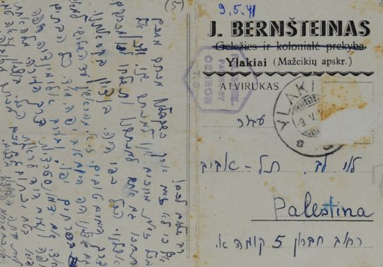 The last postcard that Eta, Jacob and Hinda Bernstein sent to Ida Lev (Bernstein) in Tel Aviv from Ylakiai, Lithuania, May 9, 1941. Credit: Yad Vashem.