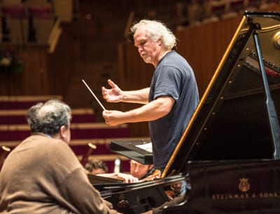 Seated at the Opera House’s new Steinway concert grand is one of the world’s finest pianists, Yefim Bronfman. He’s casual too, in a big brown cardigan over a blue striped polo shirt. At his feet are a couple of cardboard coffee containers and a brightly coloured canvas bag. He nods to Runnicles and instantly the tympani becomes the starter’s gun for the strings to stream into the somber opening of Brahms first Piano Concerto.