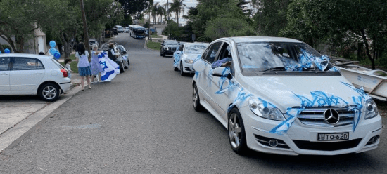 Families waved Israeli flags as they stood outside their homes joining in as circumstances allowed the celebrations of Israel’s 72 nd birthday. A large fleet of vehicles headed out to drive around the Eastern Suburbs visiting streets on which students live.