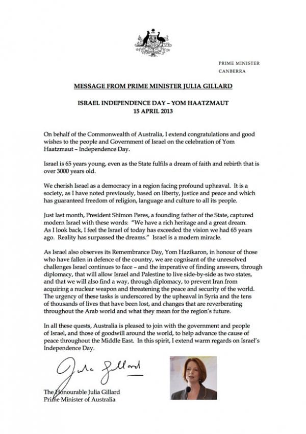 Australian Prime Minister Julia Gillard has sent greetings to the Jewish community for Yom Ha’azmaut.