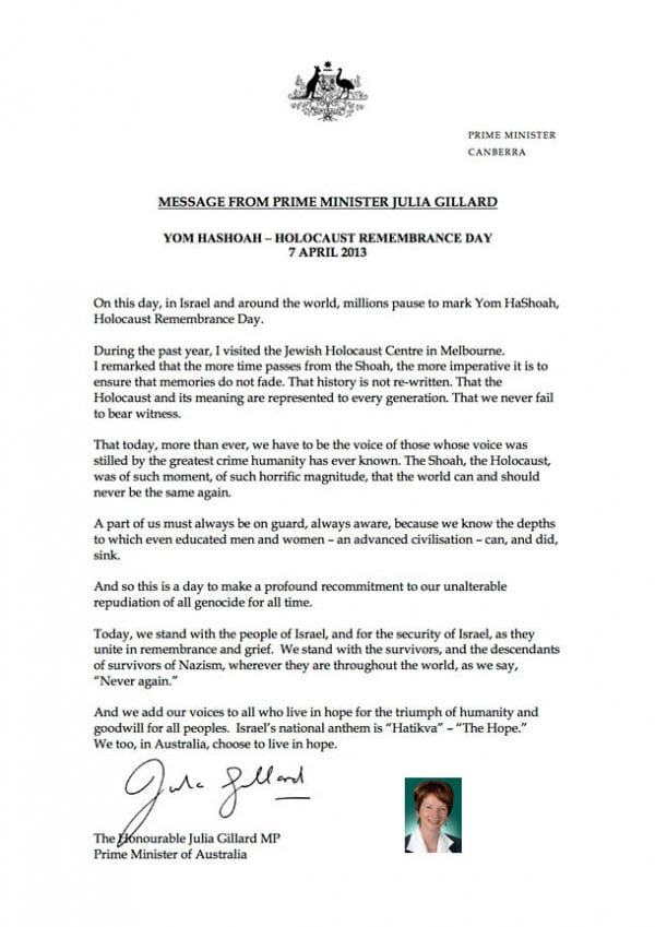 Australian Prime Minister Julia Gillard has sent a message to the community to mark Yom Hashoah.